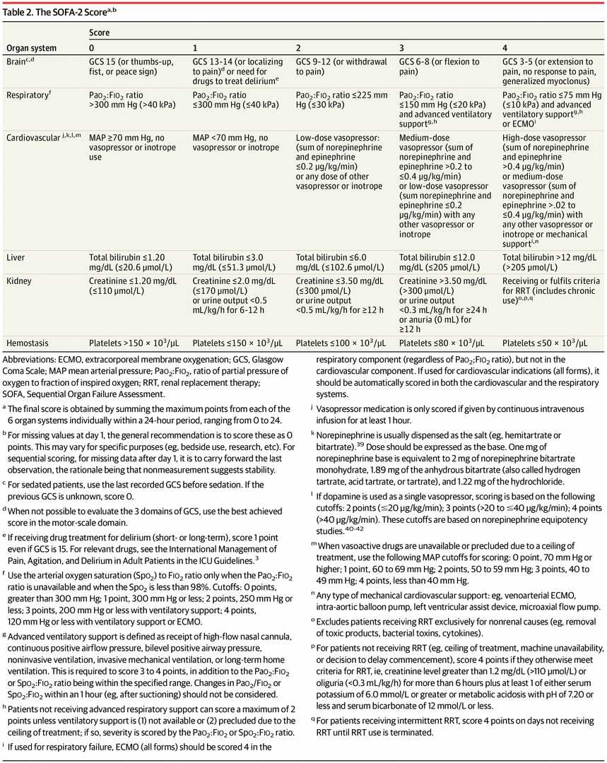 Ranzani OT, Singer M, Salluh JIF, et al. Development and Validation of the Sequential Organ Failure Assessment (SOFA)-2 Score. JAMA. Published online October 29, 2025. doi:10.1001/jama.2025.20516